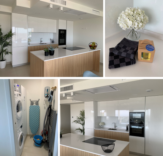 De moderne, open keuken is van alle gemakken voorzien om u het leven makkelijk te maken: koel-vriescombinatie, combi-oven, microgolfoven, inductiekookplaat, vaatwasser, toaster, koffiezet (Nespresso cups), fruitpers en waterkoker.