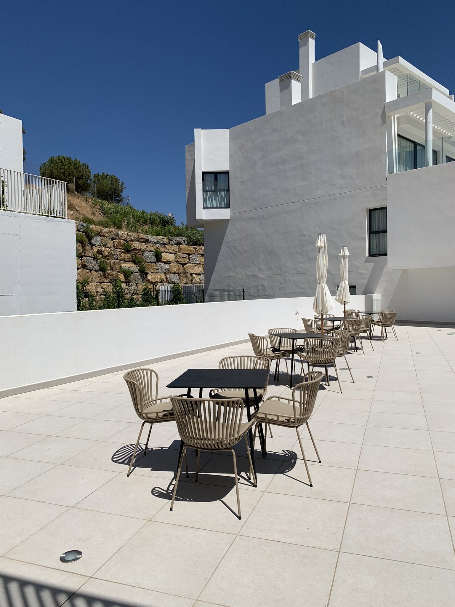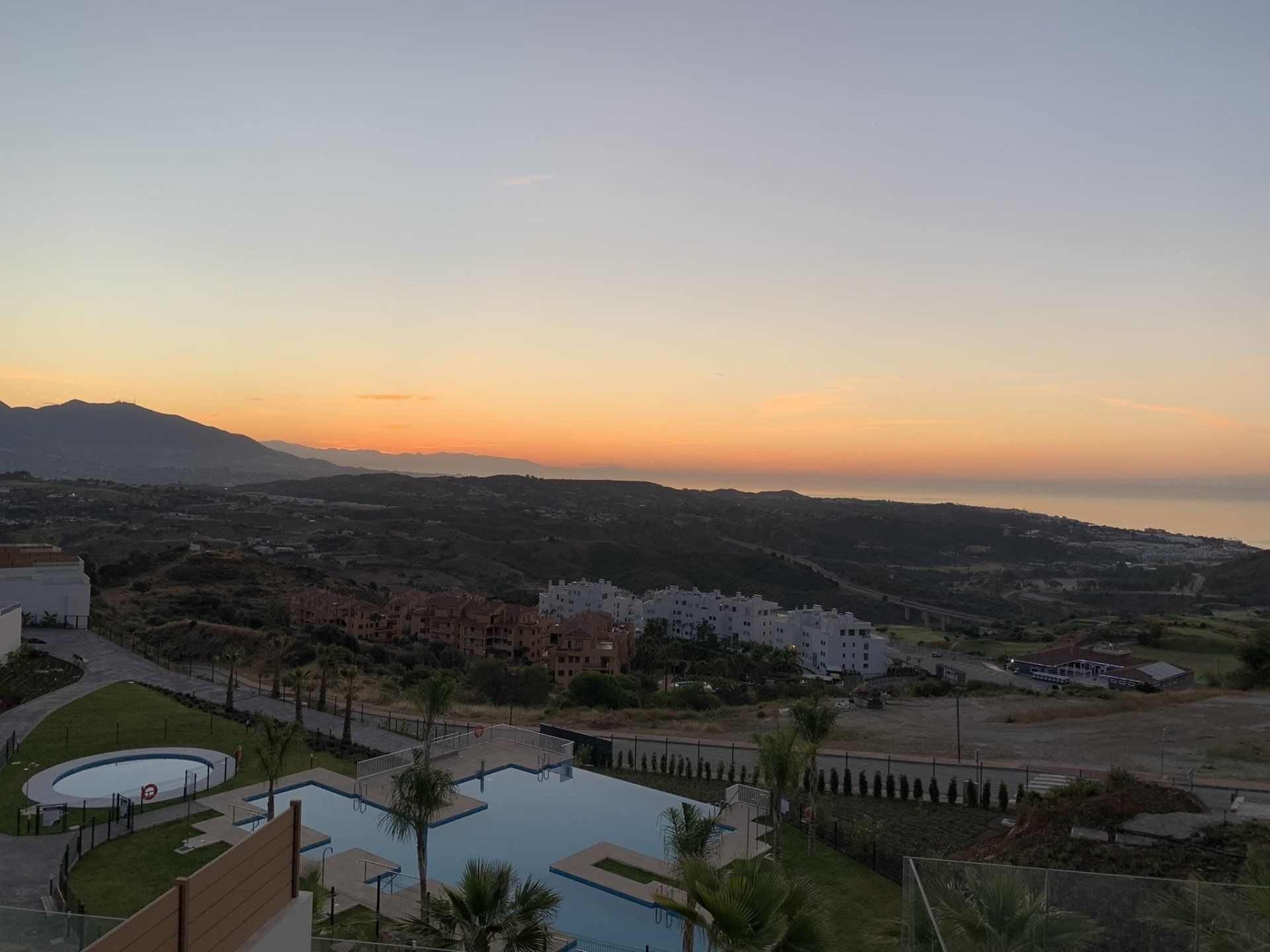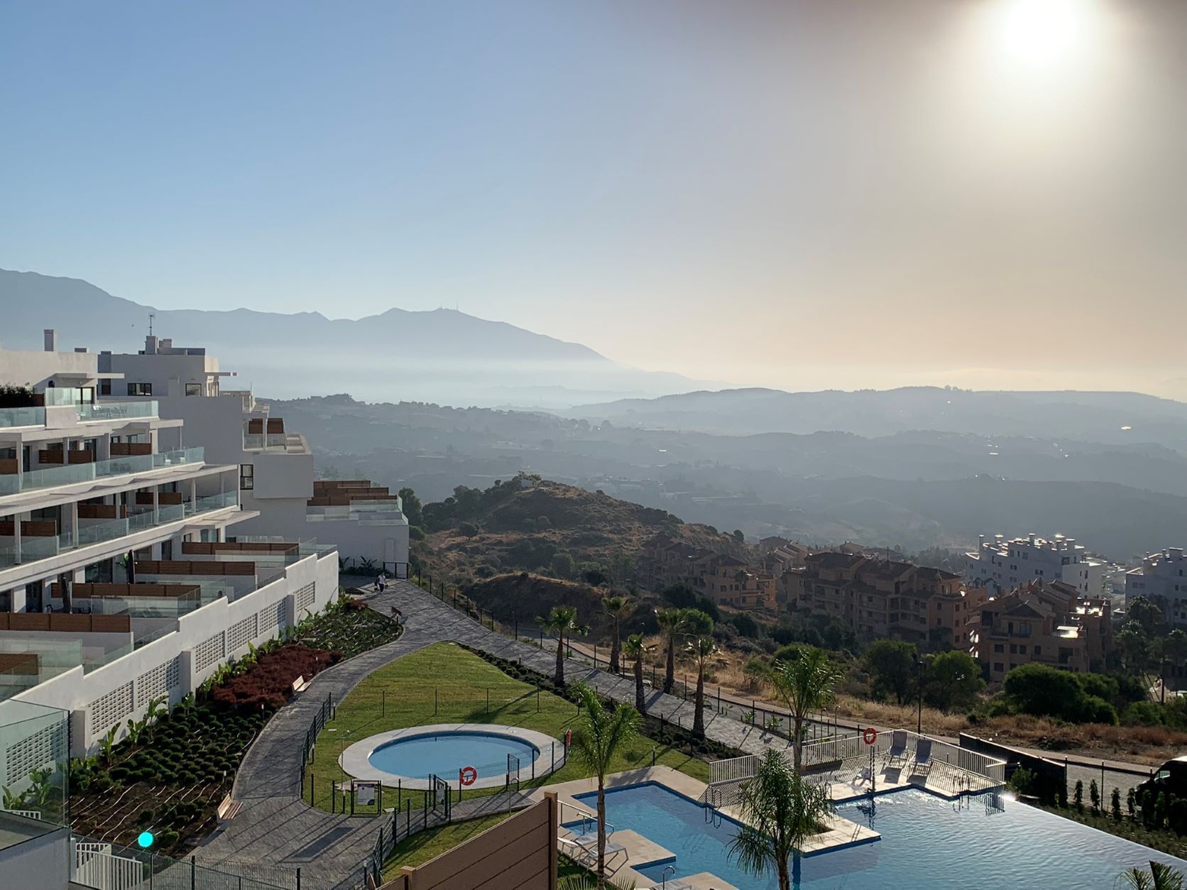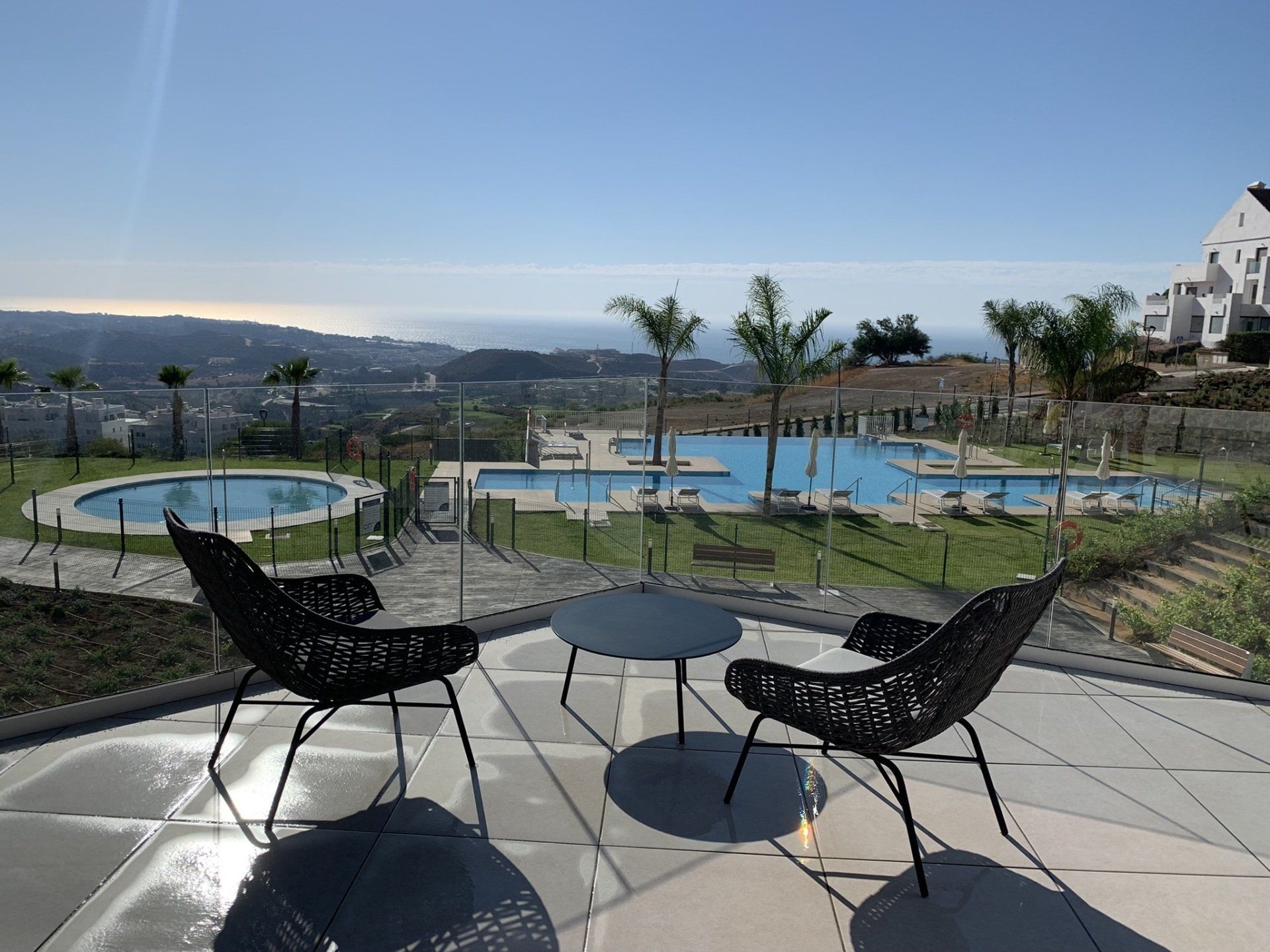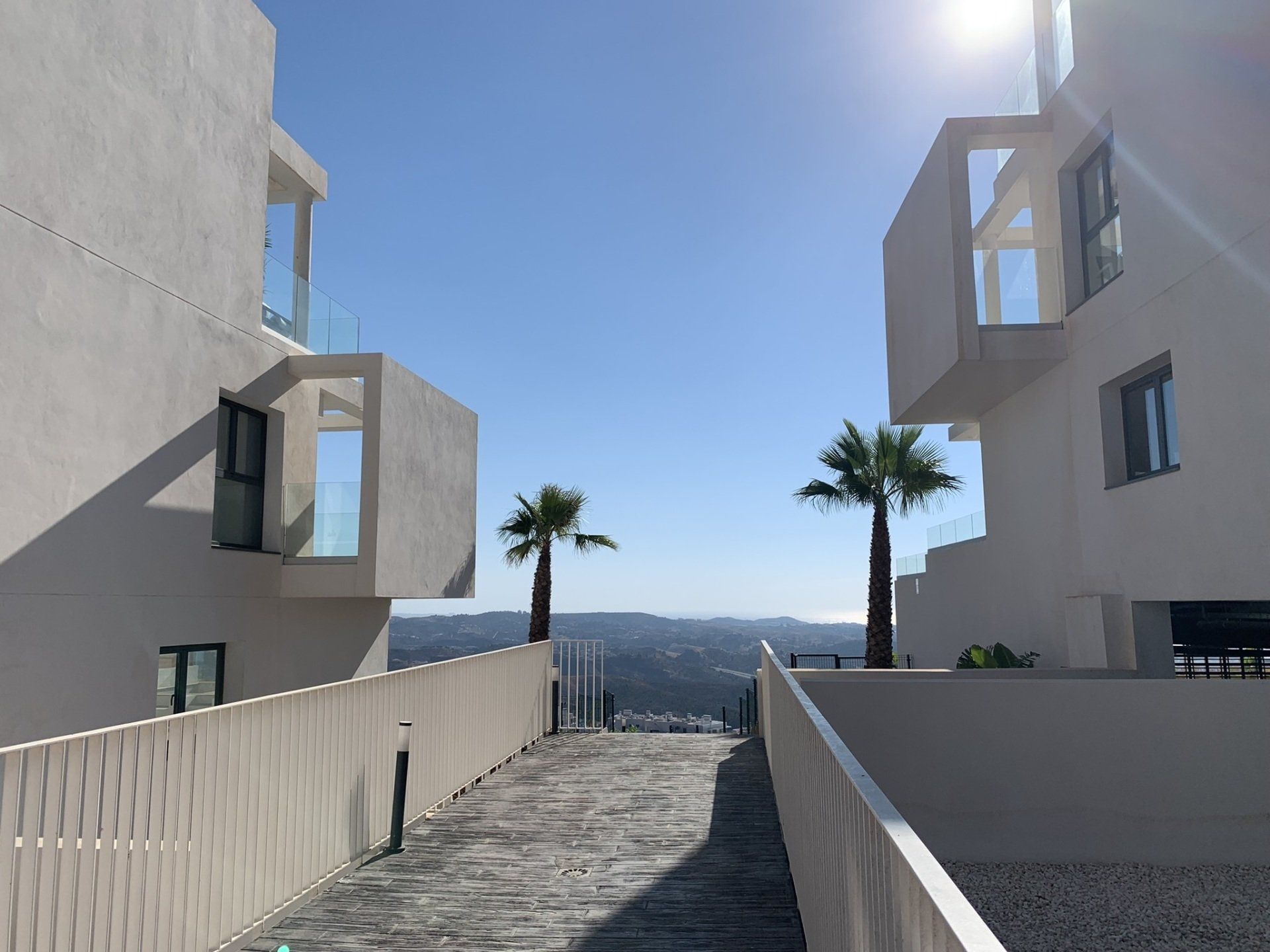 De glazen balustrades laten je vanuit elke hoek genieten van het subliem panoramisch uitzicht over de bergen, Mijas, de Middellandse Zee en Calanova.