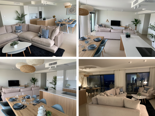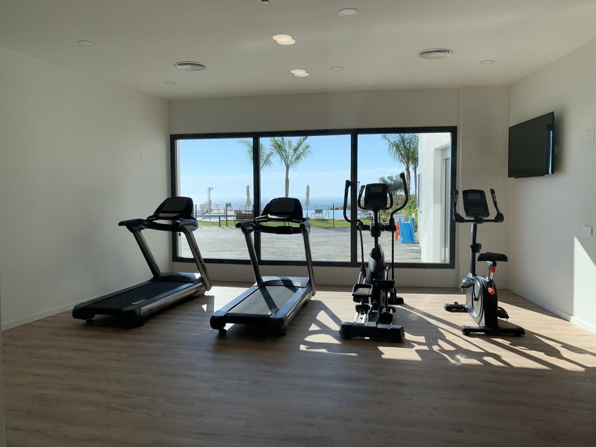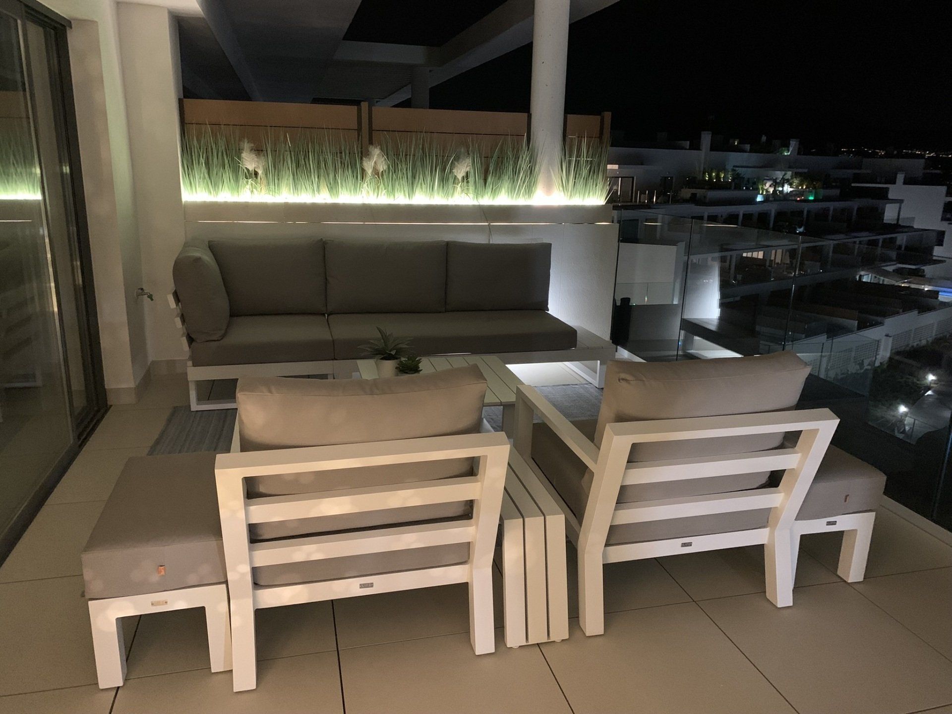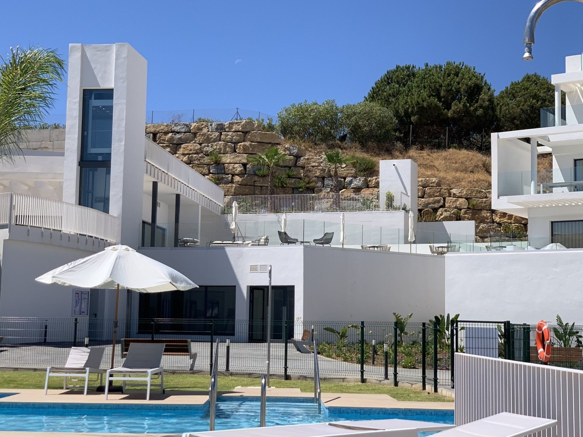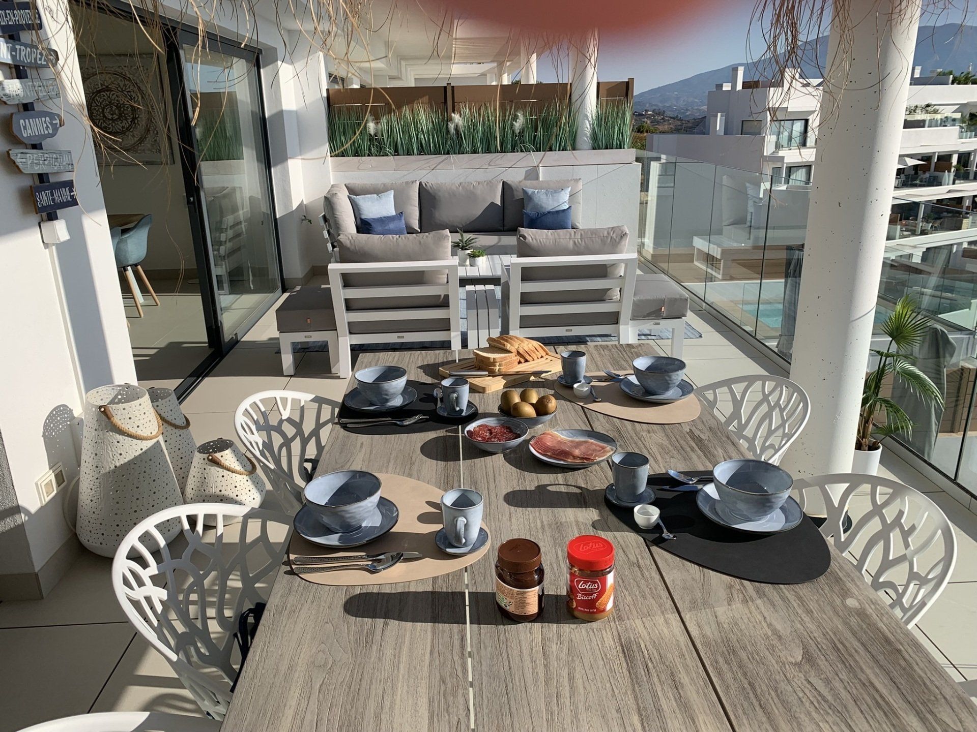 De glazen balustrades laten je vanuit elke hoek genieten van het subliem panoramisch uitzicht over de bergen, Mijas, de Middellandse Zee en Calanova.